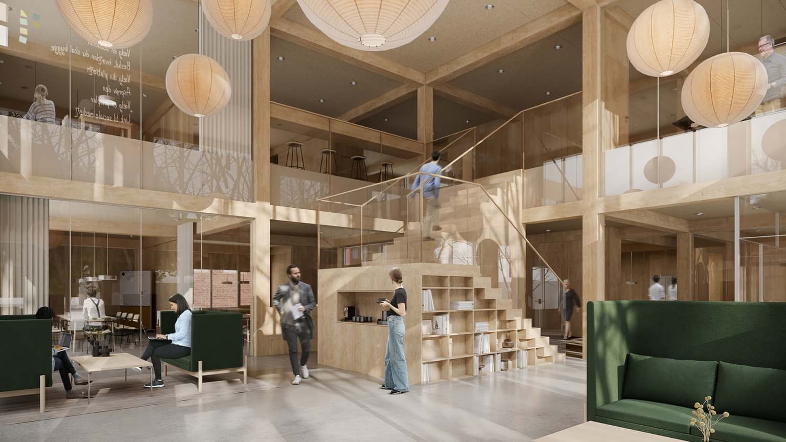 The new office building will be connected to the existing administration building and positioned to form a defined and functional courtyard together with the surrounding structures. The design continues the architectural and structural principles of the historical complex, highlighting the exposed timber structure as a key architectural element. The use of red bricks ensures harmony with the existing buildings and contributes to a coherent architectural expression.