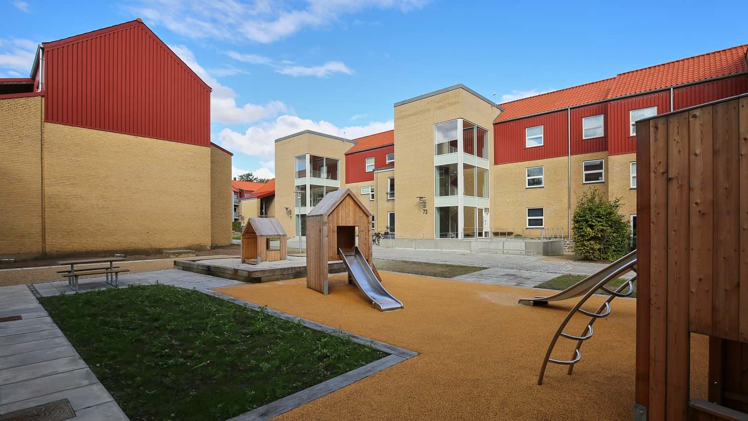 Bebyggelsen består af toværelses lejligheder i stueplan med egen have til studerende og seniorer. De fritliggende fireværelses byhuse i to plan er tiltænkt børnefamilier og de som ønsker mere plads. Der er også mulighed for at bo flere generationer under samme tag i generationshuset i tre plan.